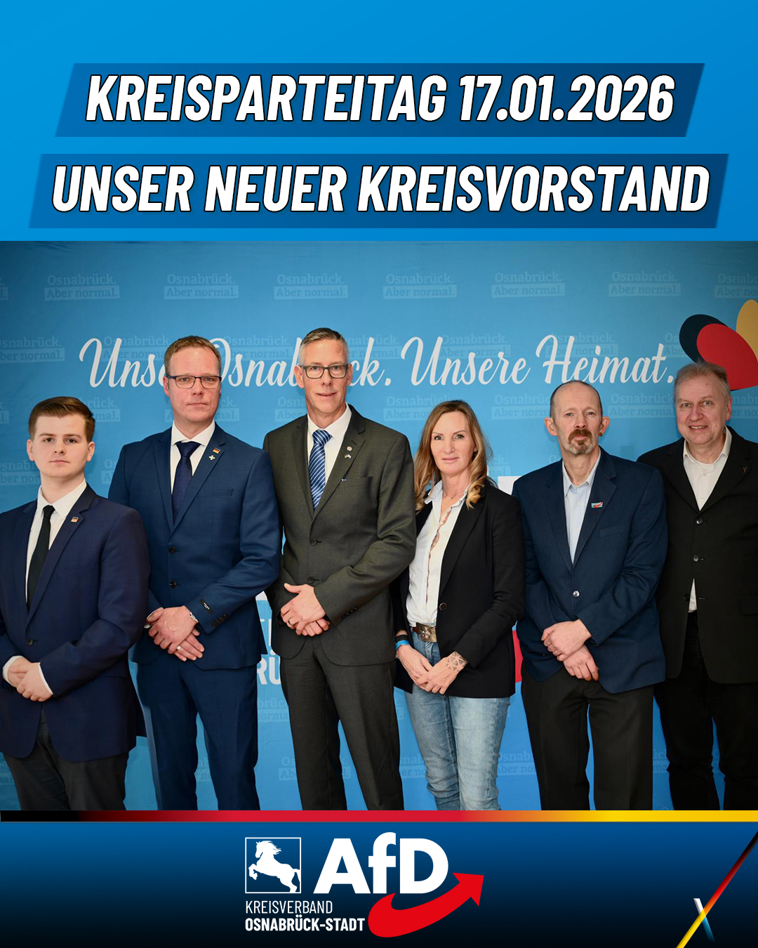 Die AfD Osnabrück-Stadt hat heute ihren satzungsmäßigen Kreisparteitag erfolgreich abgehalten. In einer harmonischen und engagierten Atmosphäre wurden nicht nur die Bundes- und Landesdelegierten bestimmt, sondern auch der Kreisvorstand neu gewählt. Die Mitglieder zeigten großes Vertrauen in die bewährte Führung und begrüßten frische Impulse durch neue Vorstandsmitglieder.